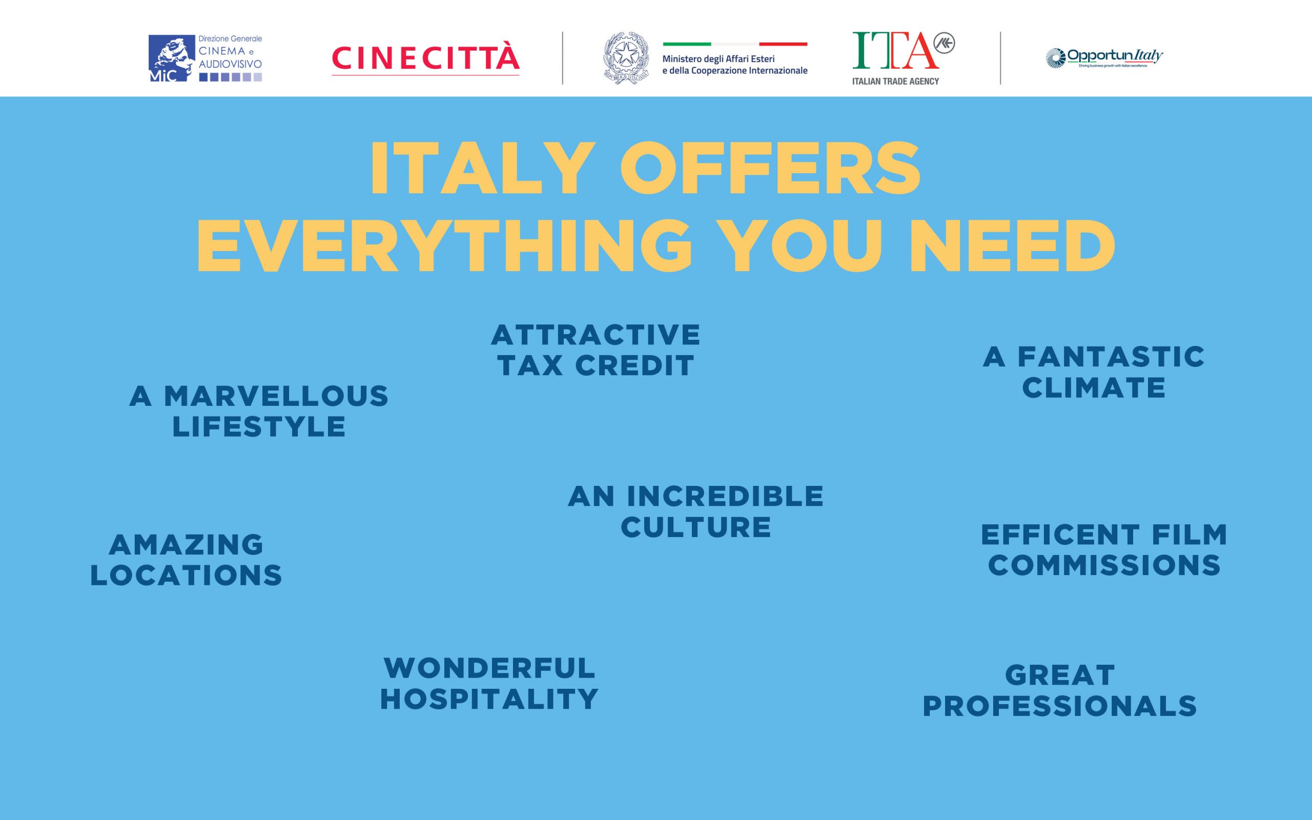 La presenza dell’Italia è coordinata dal Dipartimento per l’Internazionalizzazione di Cinecittà nell’ambito delle iniziative realizzate per la Direzione Generale Cinema e Audiovisivo del MiC, in collaborazione con l’Agenzia ICE.